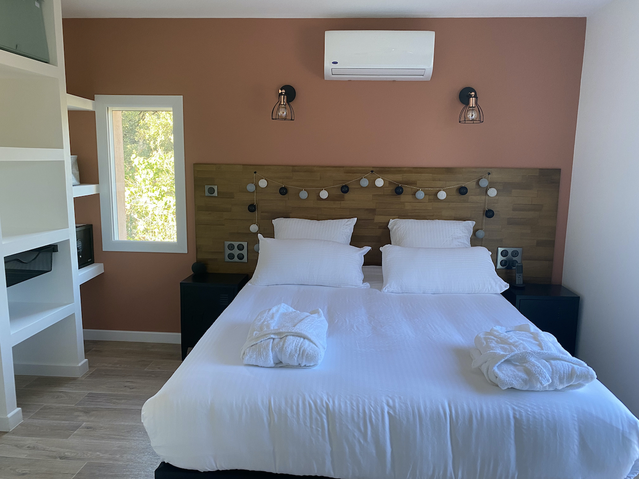 – Lits faits à l’arrivée, linge de lit de remplacement, linge de bain, peignoirs, sèche-cheveux, produits d’entretien et de toilettes fournis
